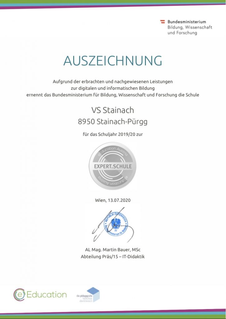 Durch unse­re Akti­vi­tä­ten mit unse­ren Schü­le­rIn­nen und die Aus­bil­dung der Leh­re­rIn­nen im IT-Bereich, erhielt unse­re Schu­le vom Bun­des­mi­nis­te­ri­um für Bil­dung, Wis­sen­schaft und For­schung die Aus­zeich­nung zur Expert- Schu­le.